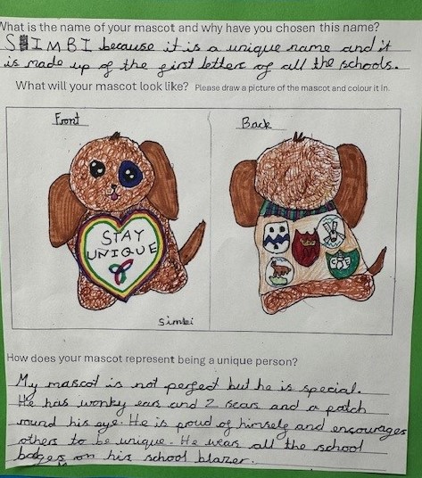 A team of pupils from each school shortlisted ten to bring to a pupil working party, where the final decision was made.  It was tough, but in the end, Simbi, was considered to be the best mascot to represent being a unique child of God.